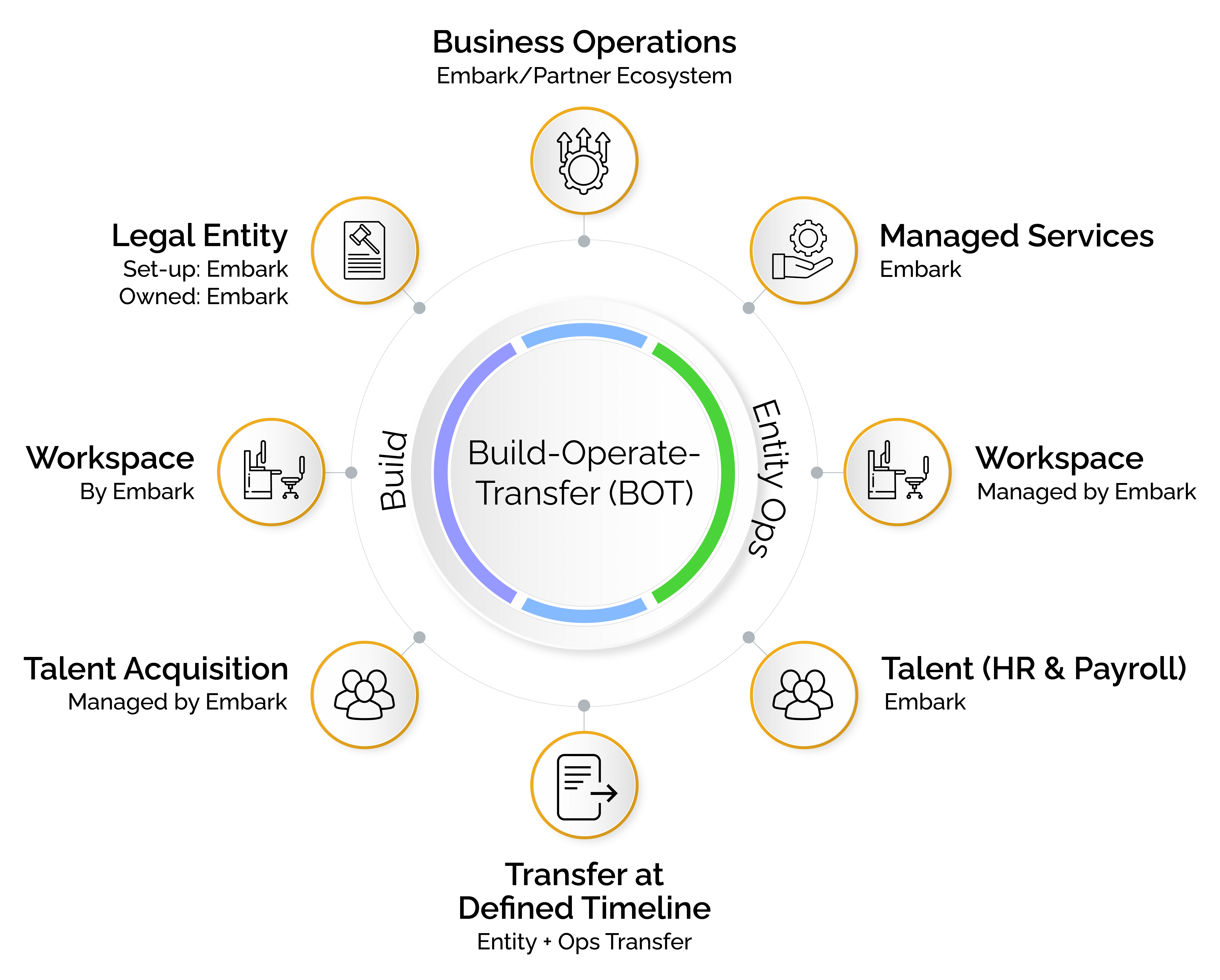 Embark builds, owns, and operates the GCC end-to-end—including entity management and agreed business operations—before transferring both the entity and operations to the client at a defined point.