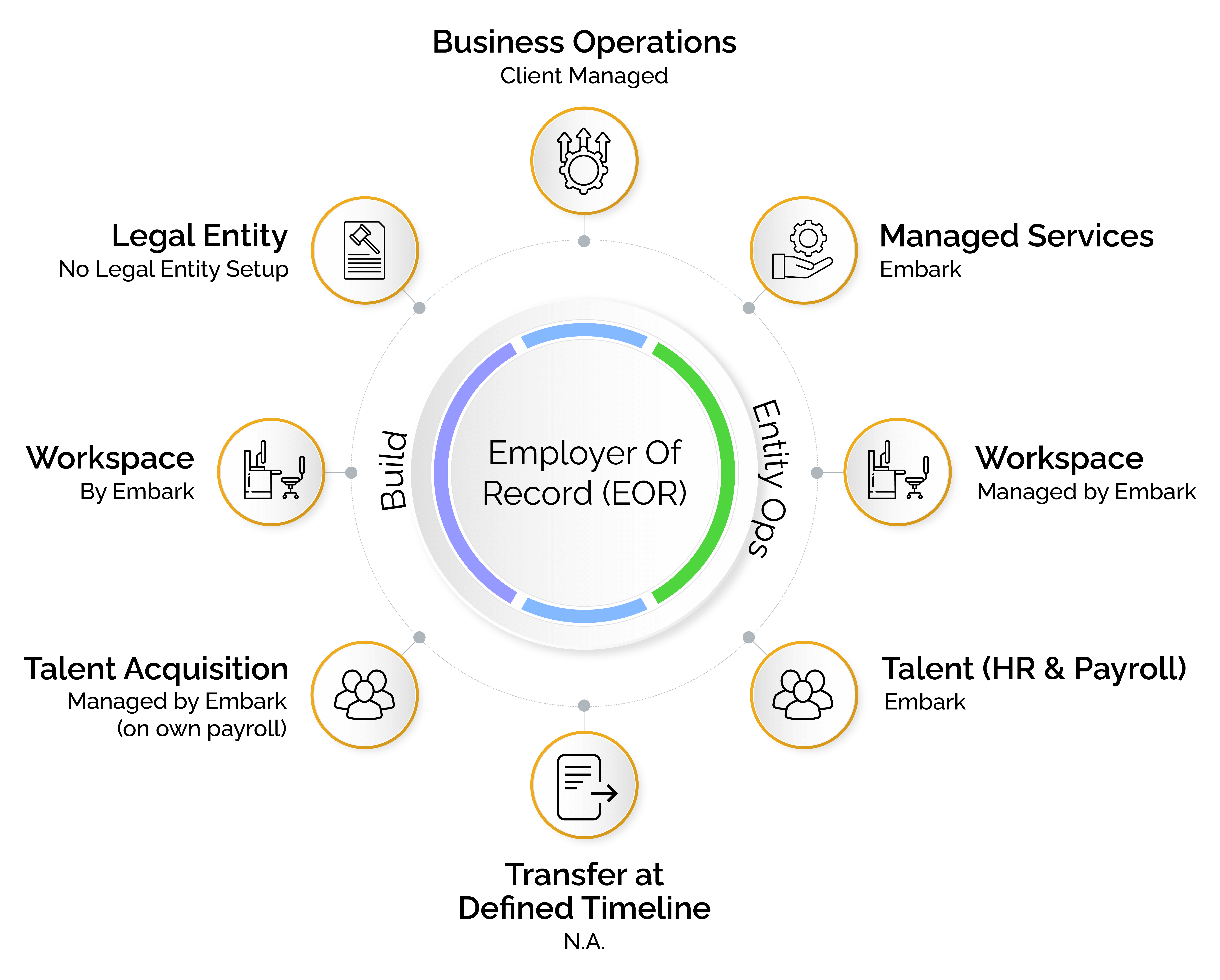 Embark employs talent on its own payroll, manages HR, payroll, and compliance, and enables the client to run day-to-day business operations without setting up an India legal entity.