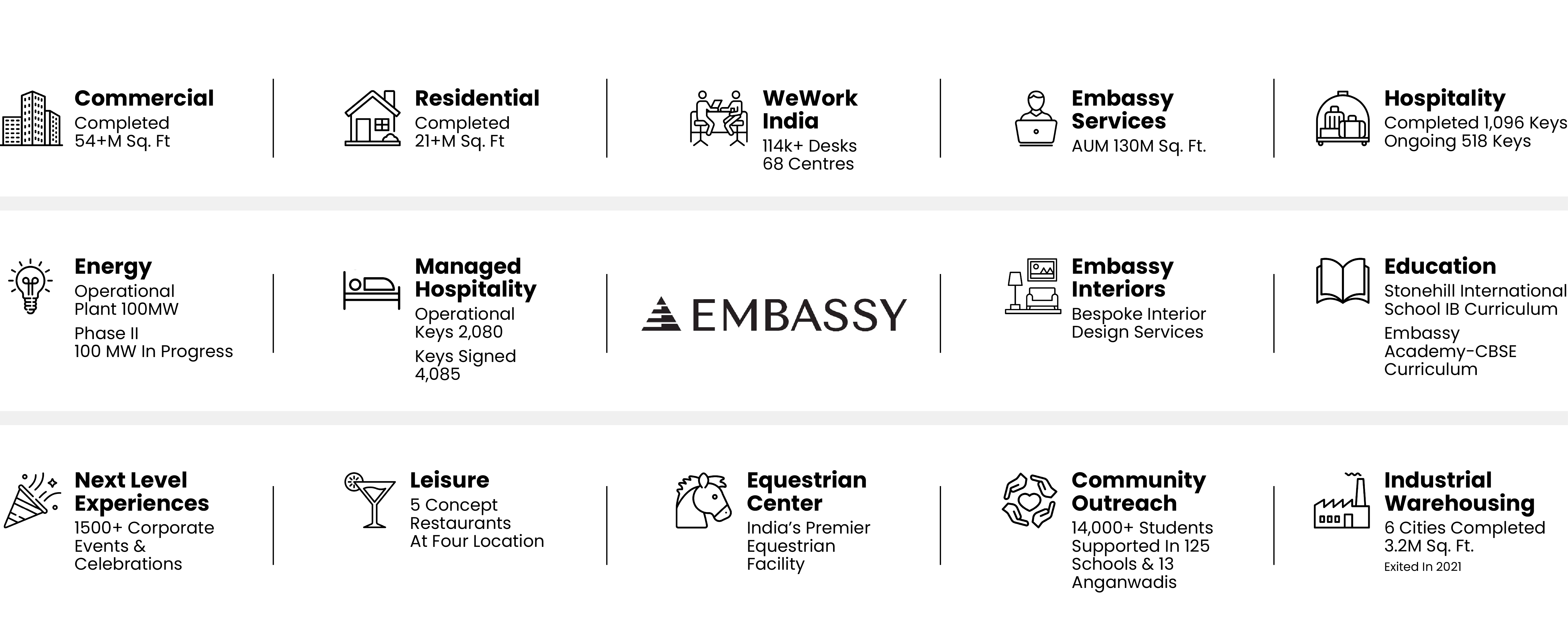 For more than 30 years, Embassy Group has built with integrity and excellence. The group’s portfolio spans over 75 million sq. ft. across commercial, residential, industrial, and hospitality spaces, anchored in quality and long-term value. With 21 million sq. ft. of completed homes and as sponsors of India’s first and Asia Pacific’s largest REIT by area, Embassy continues to build with trust, scale, and a future-ready vision.